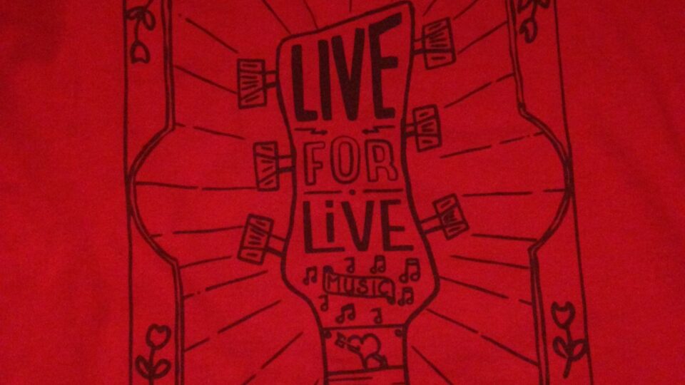 A closer look at the red t-shirt that so many music fans are wearing tonight in the Irvine City Hall as they wait to hear that Irvine will once again have an outdoor music venue — in time for summer!